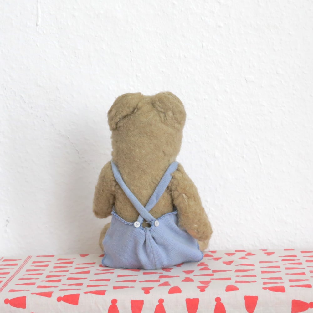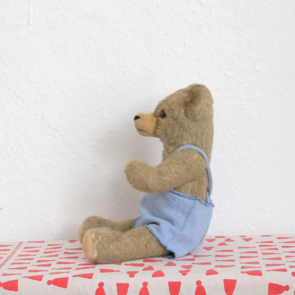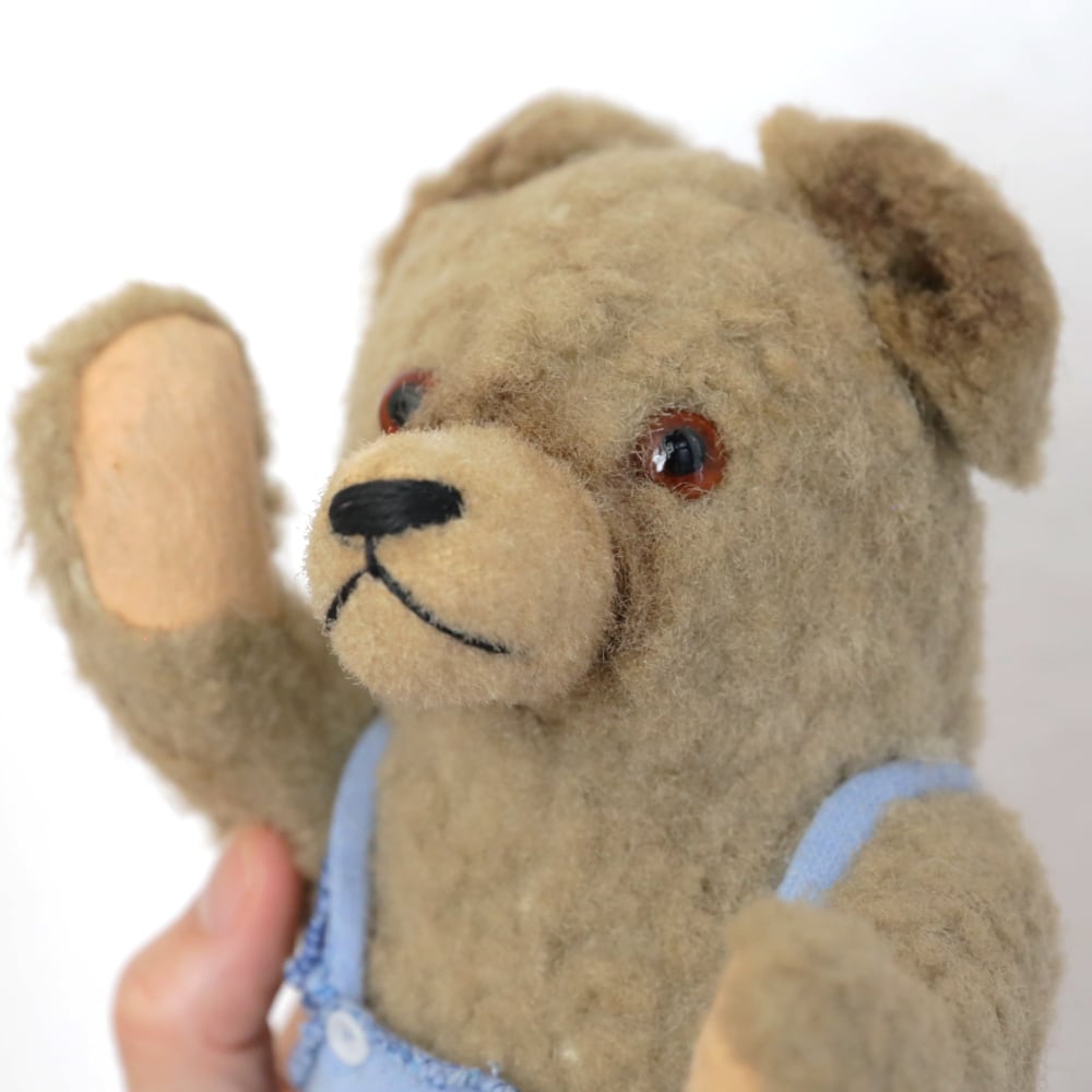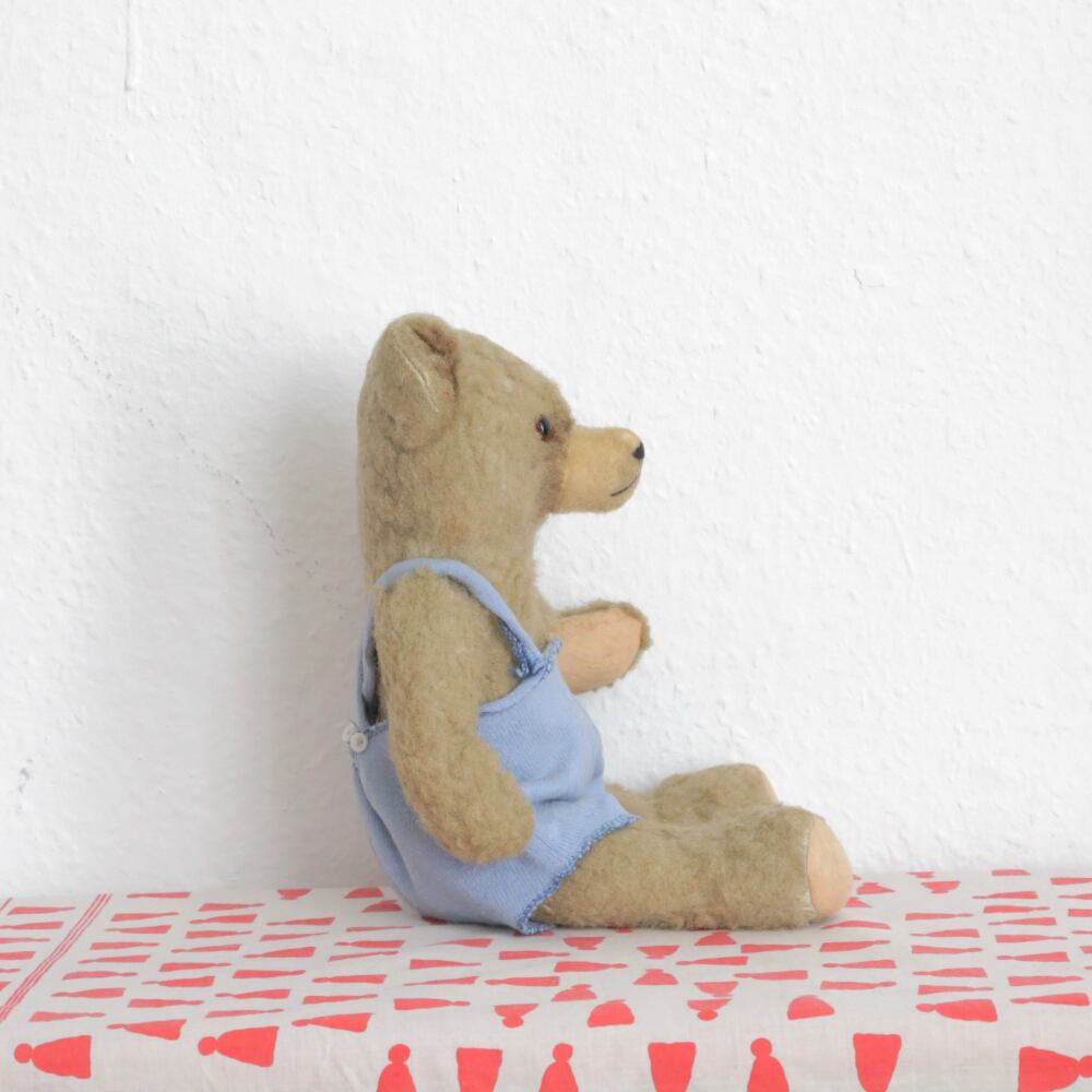 ブルーのサロペットがお似合いの、甘えんぼ顔アンティークくまさんです。